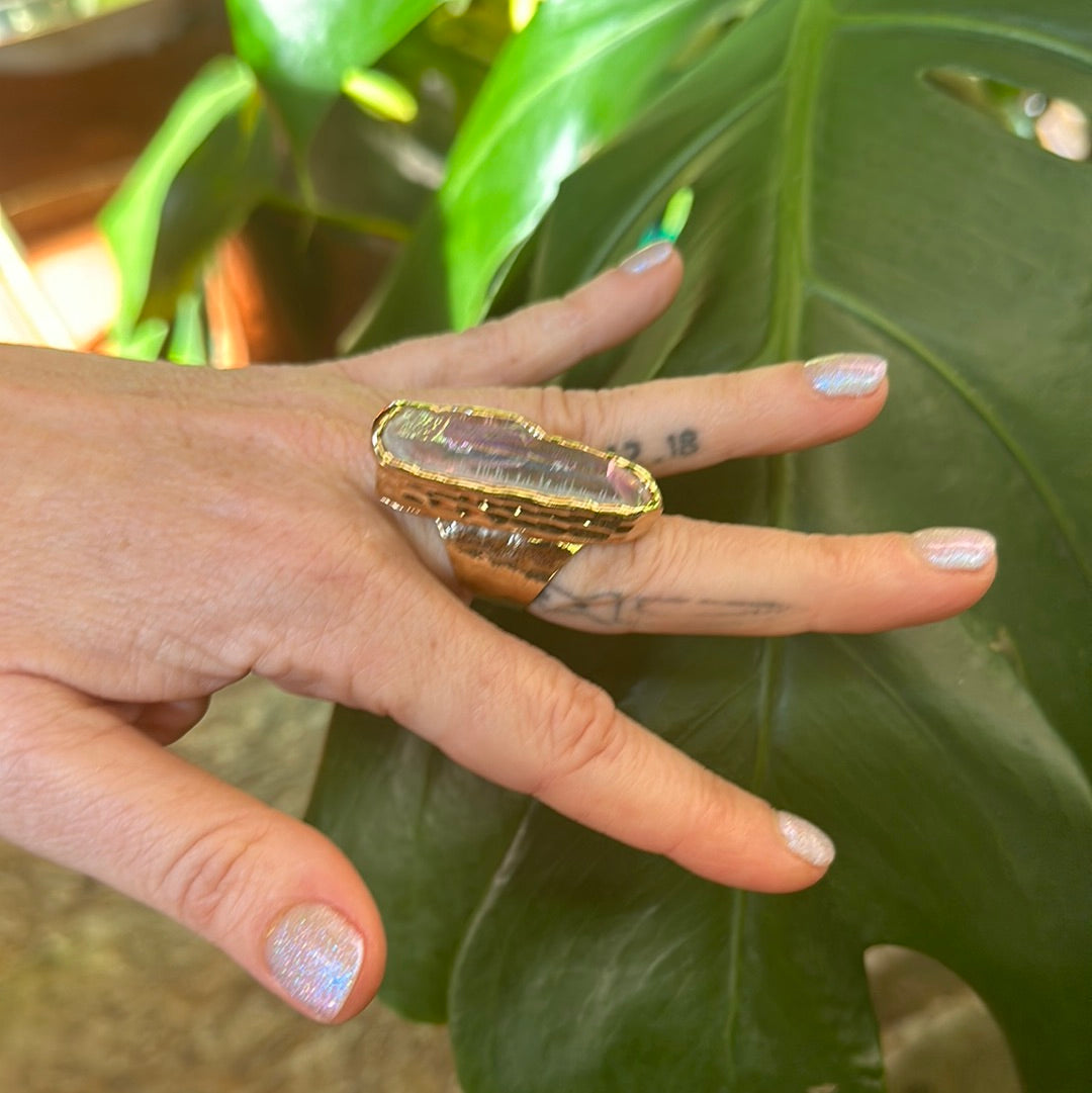 Lemurian quartz stone set in brass with a very heavy real 24k overlay.