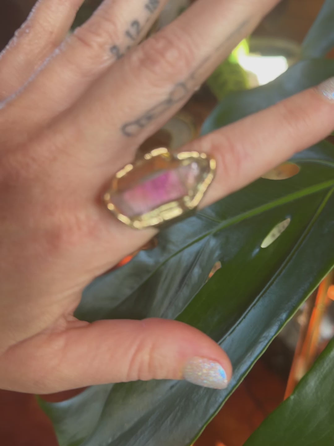 Lemurian quartz stone set in a handmade brass ring with a very heavy real 24k gold overlay (10 x the weight of a gold plating) to keep your ring gold!