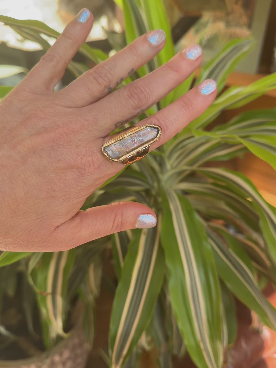 Lemurian quartz stone set in a handmade brass ring with a very heavy real 24k gold overlay (10 x the weight of a gold plating) to keep your ring gold!