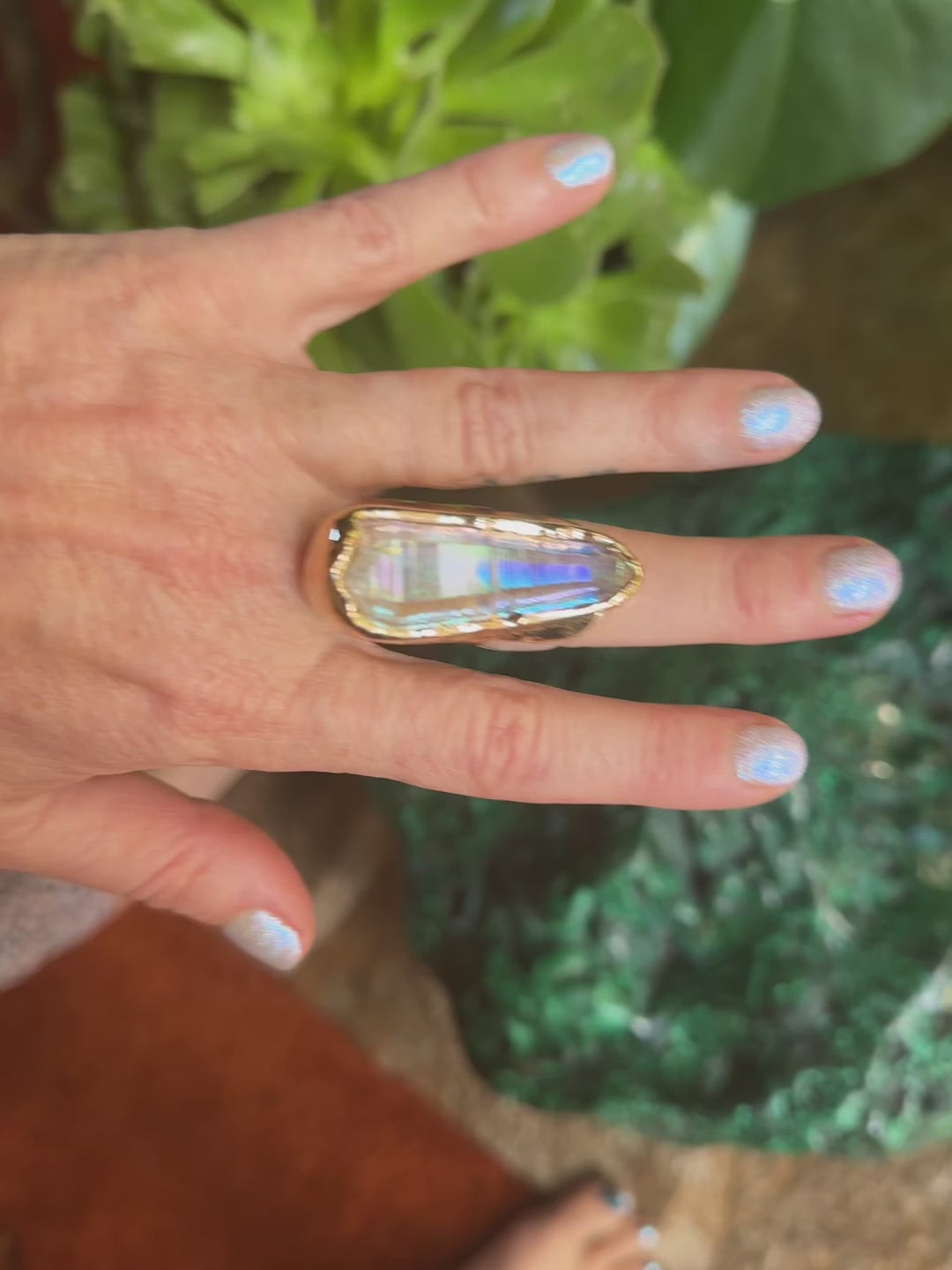 Lemurian quartz stone set in a handmade brass ring with a very heavy real 24k gold overlay (10 x the weight of a gold plating) to keep your ring gold!