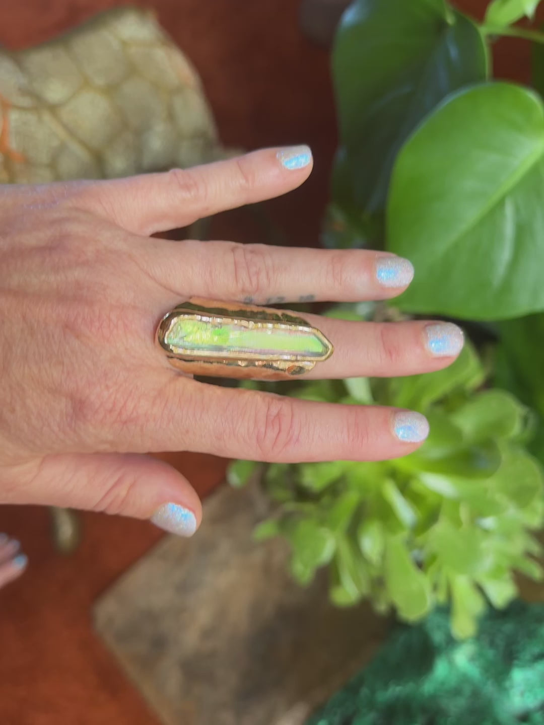 Lemurian quartz stone set in a handmade brass ring with a very heavy real 24k gold overlay (10 x the weight of a gold plating) to keep your ring gold!