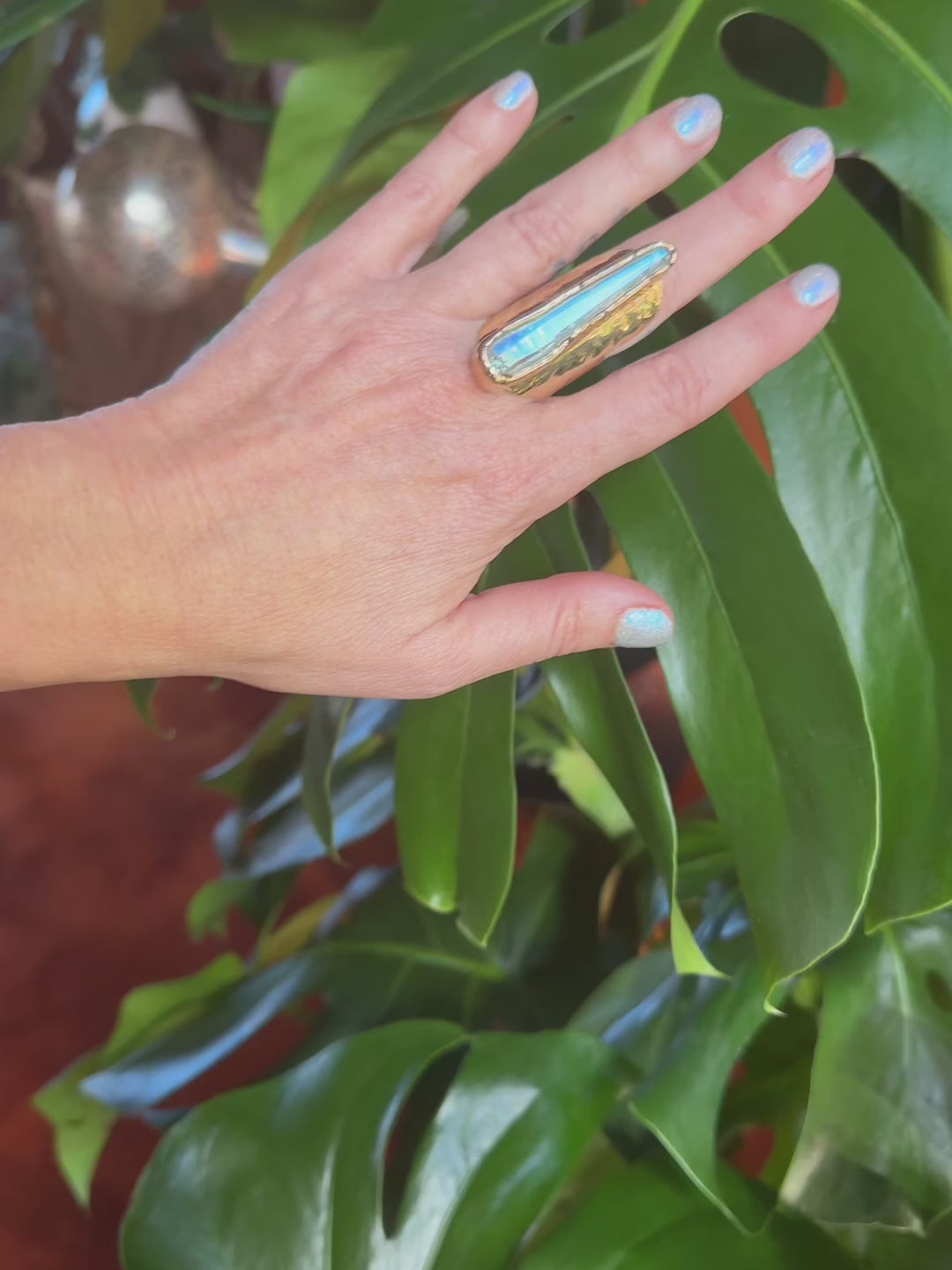 Lemurian quartz stone set in a handmade brass ring with a very heavy real 24k gold overlay (10 x the weight of a gold plating) to keep your ring gold!