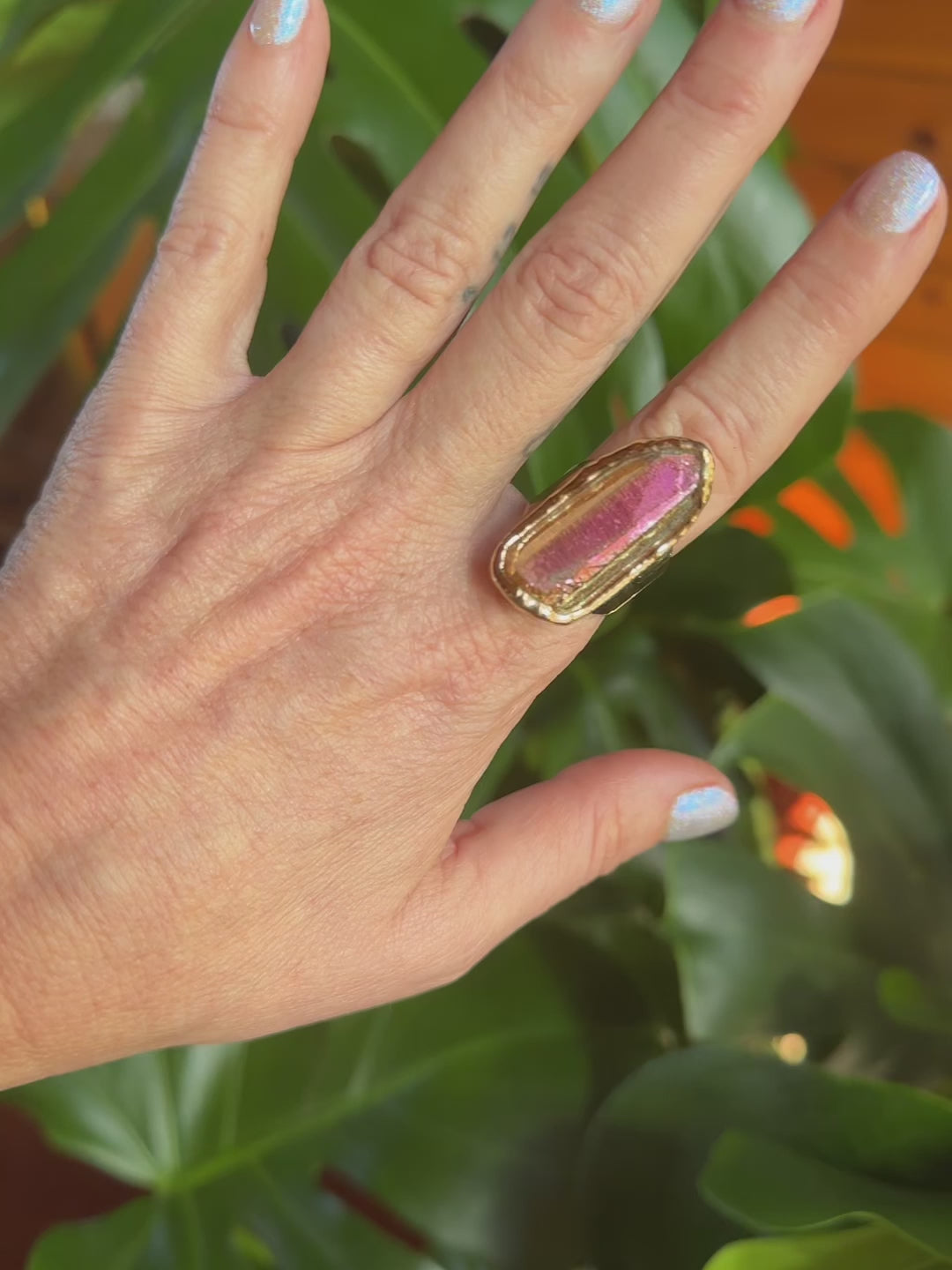 Lemurian quartz stone set in a handmade brass ring with a very heavy real 24k gold overlay (10 x the weight of a gold plating) to keep your ring gold!