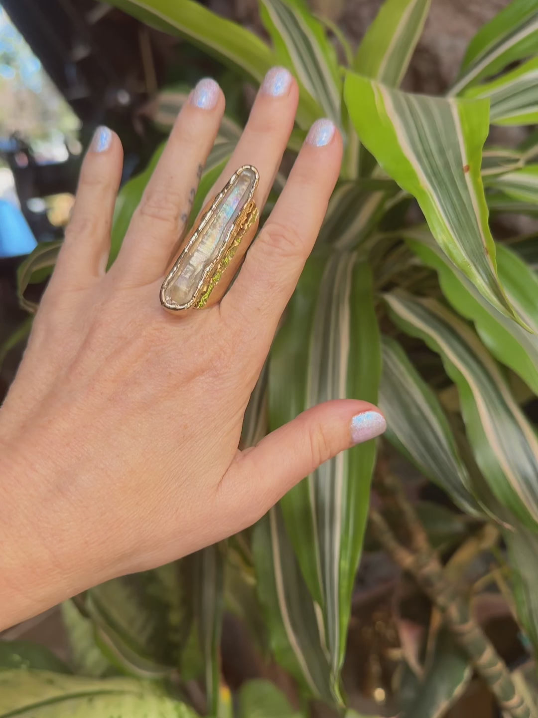 Lemurian quartz stone set in a handmade brass ring with a very heavy real 24k gold overlay (10 x the weight of a gold plating) to keep your ring gold!