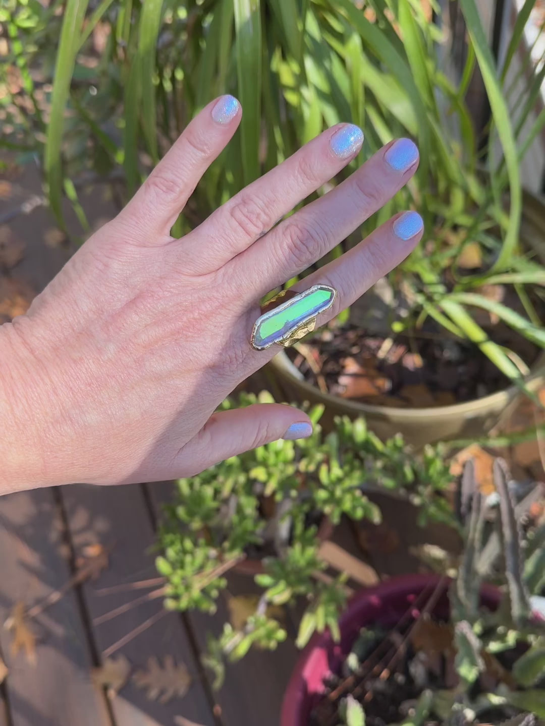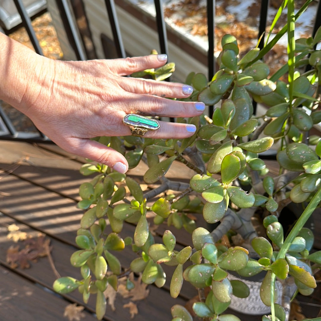Lemurian quartz stone set in a handmade brass ring with a very heavy real 24k gold overlay (10 x the weight of a gold plating) to keep your ring gold!