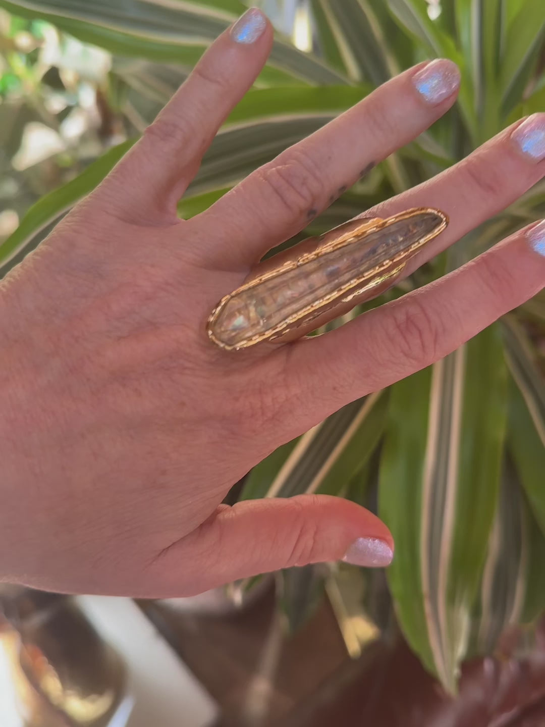 Lemurian quartz stone set in a handmade brass ring with a very heavy real 24k gold overlay (10 x the weight of a gold plating) to keep your ring gold!
