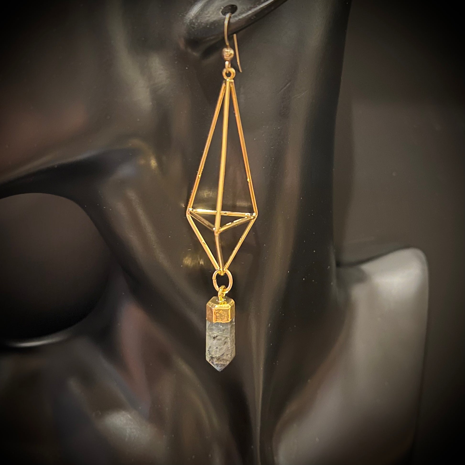 Lakshmi Earrings come with: Clear quartz, rose quartz, smoky quartz, black onyx, labradorite, lapis lazuli. Available in long or short stone.