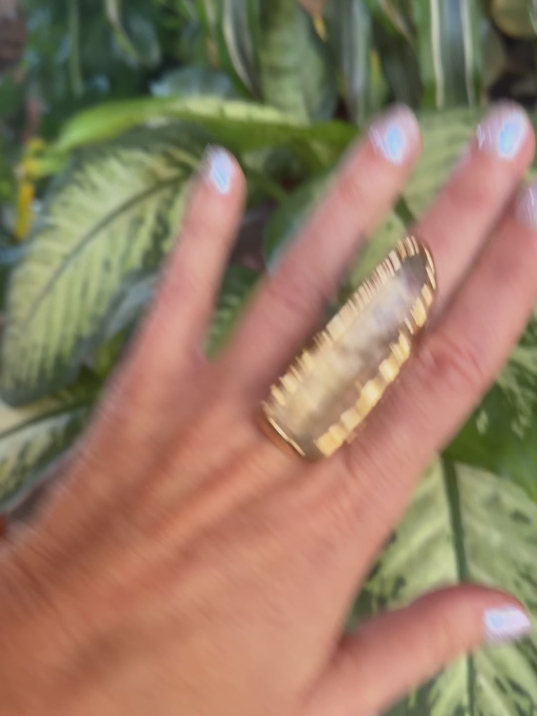 Lemurian quartz stone set in a handmade brass ring with a very heavy real 24k gold overlay (10 x the weight of a gold plating) to keep your ring gold!