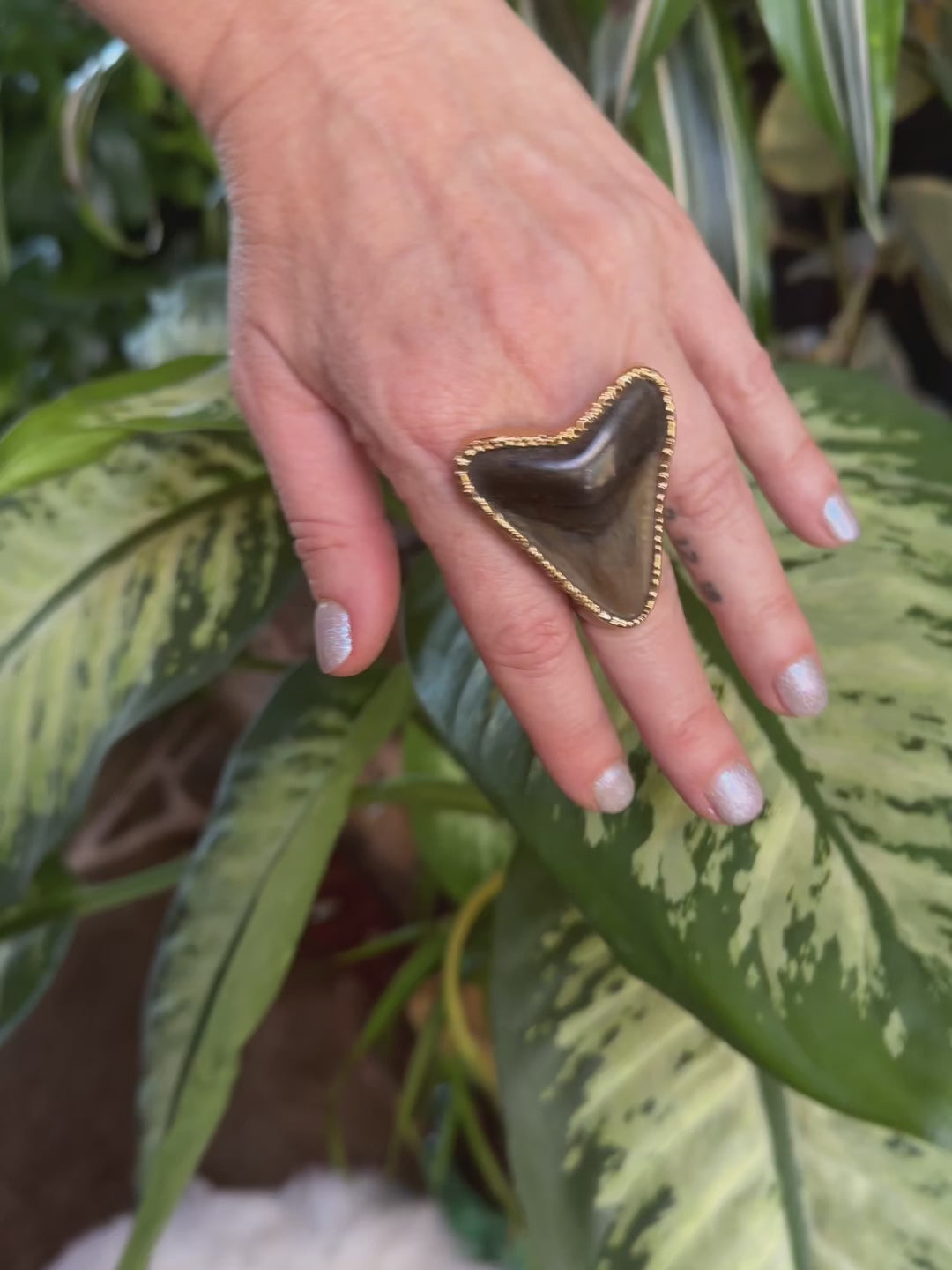A remarkable and awe-inspiring piece of jewelry that encapsulates the ancient history and power of the Megalodon shark. This ring is a symbol of reverence for Earth's prehistoric giants and the enduring fascination with fossils.