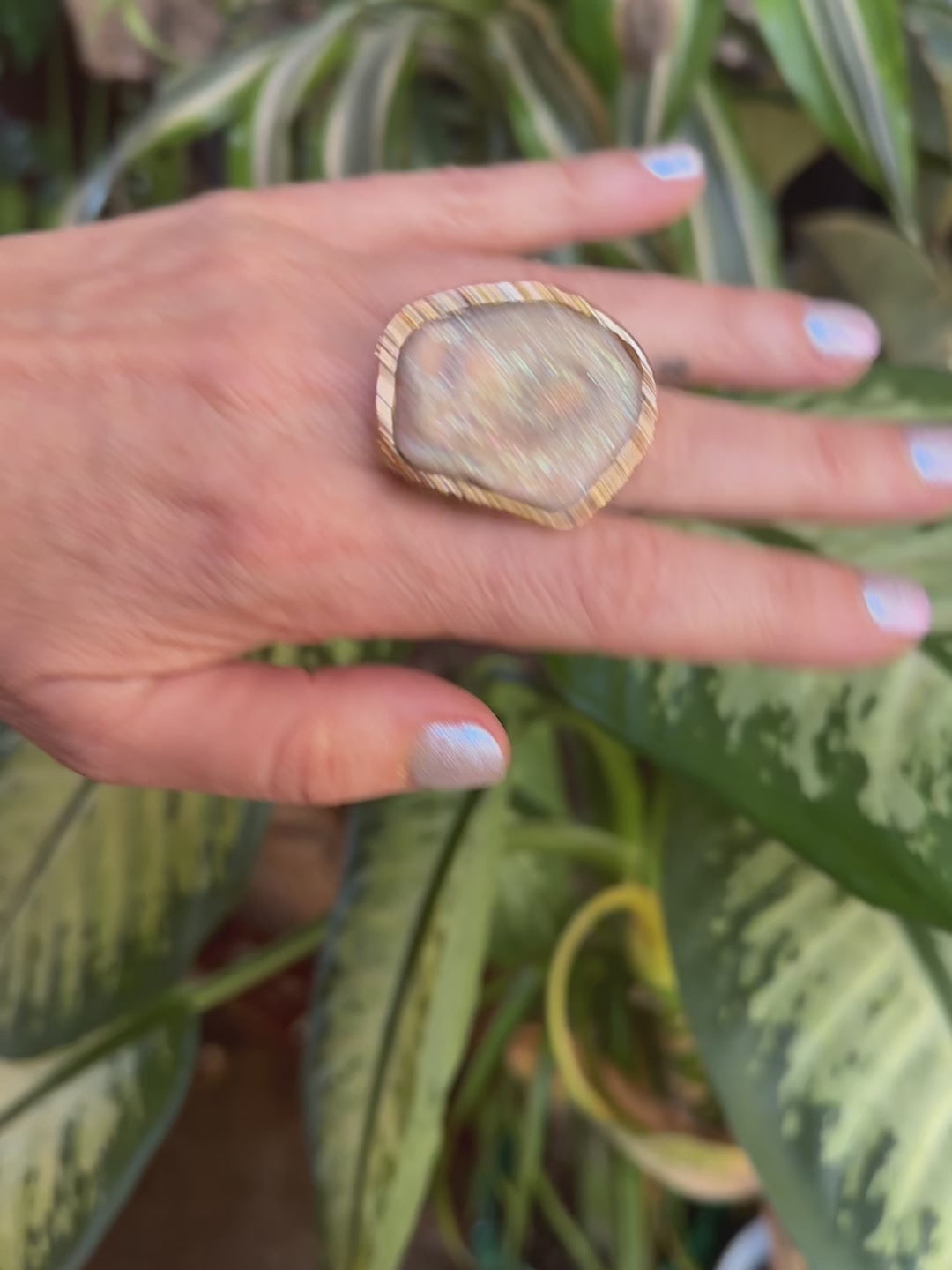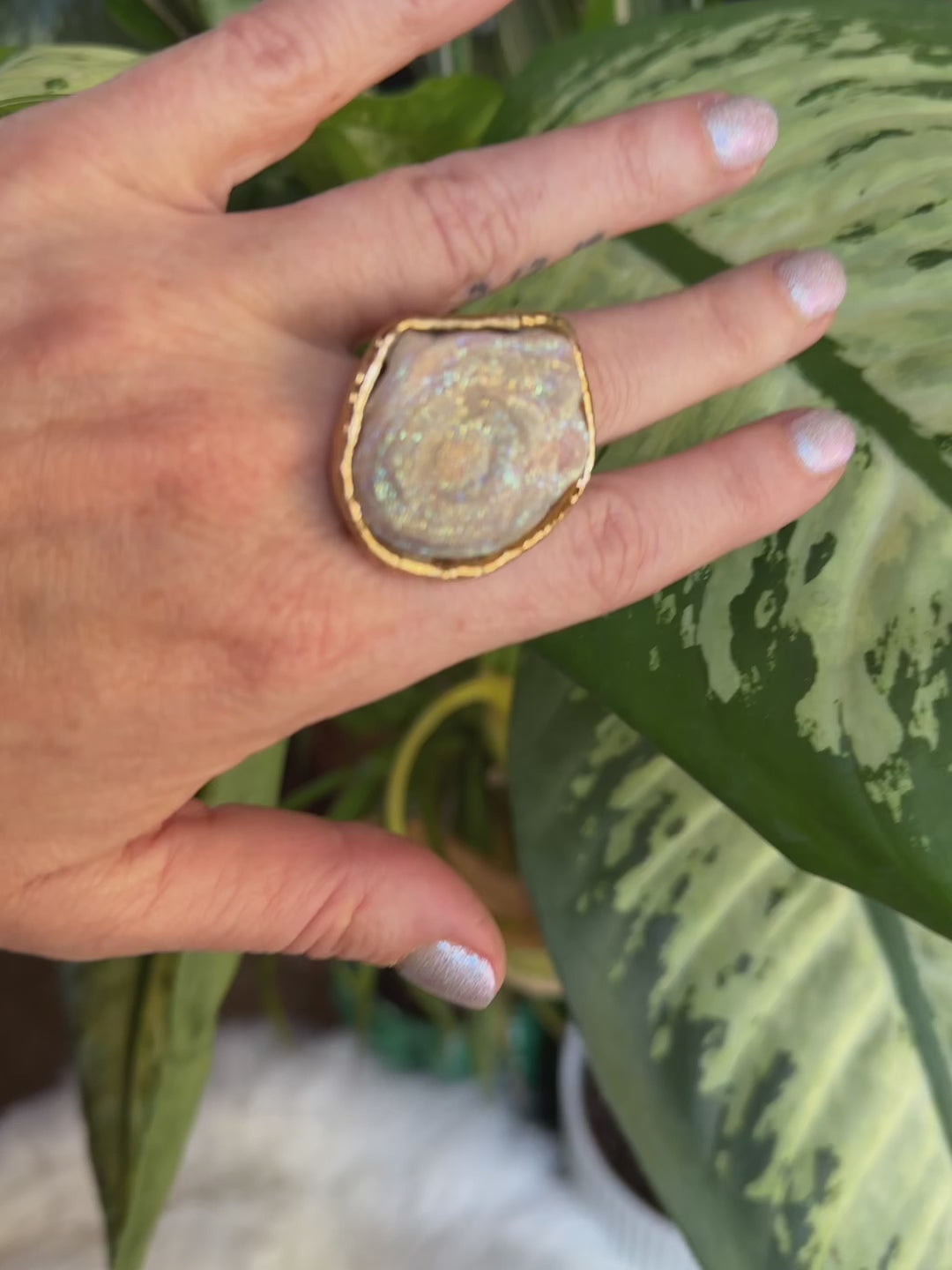 Mushroom druzy stone with angel aura finish set in brass with a very heavy layer of real 24k gold. Ring size is adjustable.