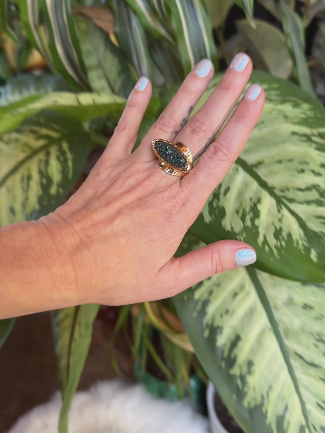 Peacock Aura Eye Shaped Druzy set in a handmade brass ring with a very heavy real 24k gold overlay (10 x the weight of a gold plating) to keep your ring gold!