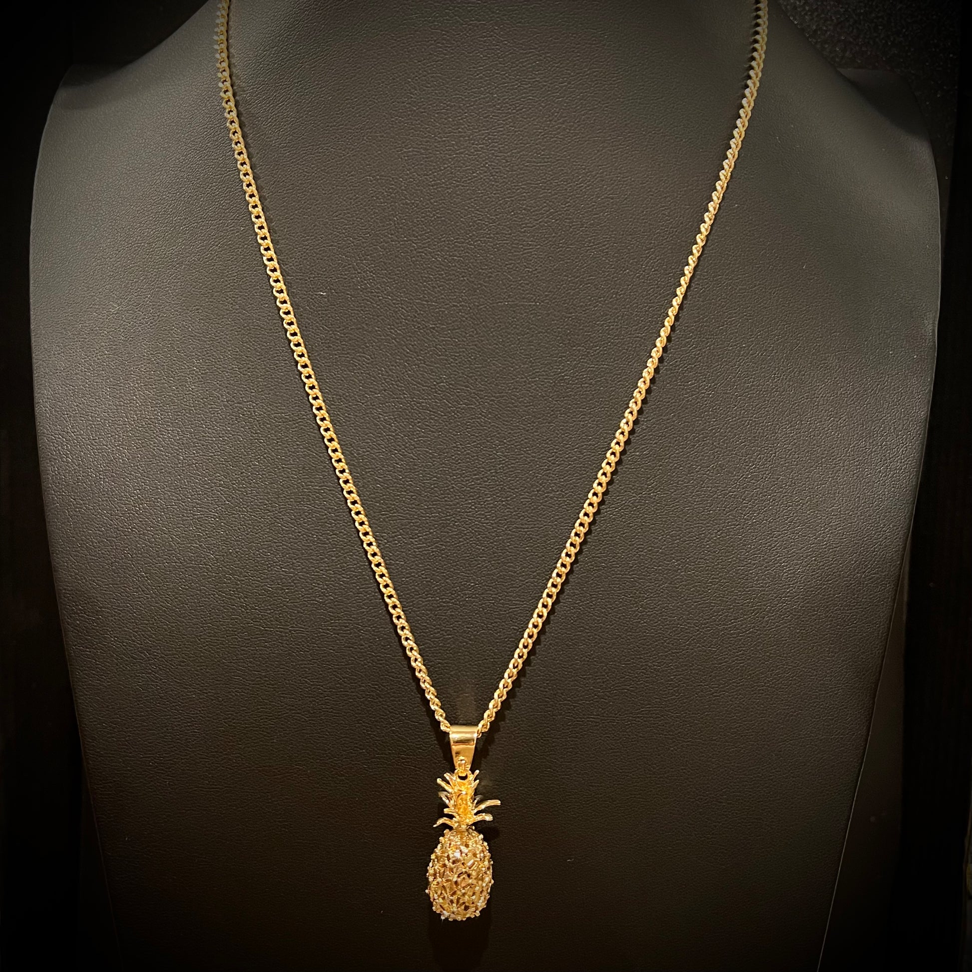 Made from 24k Gold overlay pineapple pendant on 24 karat gold overlay rope chain. Available in 18, 20, 22, and 24 inches. Pictured on bust in 24 inches.